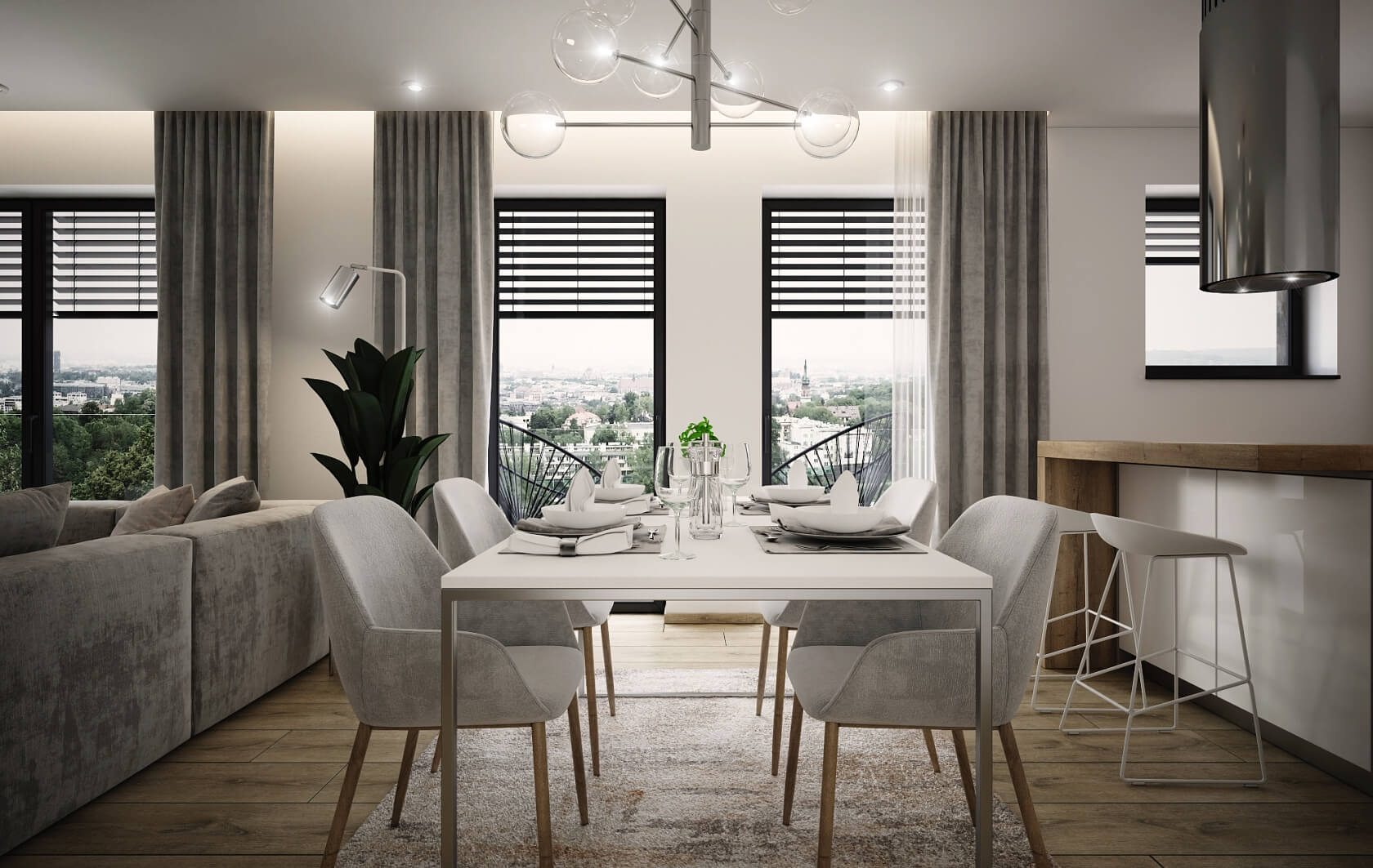 Dispozici tvoří otevřený obývací pokoj propojený s kuchyní a vstup na terasu s výhledy na město a okolní zeleň. Dále je zde ložnice s francouzským oknem, velkou šatnou a vstupem na 2. terasu, další samostatný pokoj, koupelna, technická místnost a samostatná toaleta. Tento byt má soukromý vstup na střechu, kde je možnost zelené výstadby ve vlastní režii. Terasa disponuje kapénkovou závlahou, aby zůstala i v letních měsících zelená. Na terase se nachází atrium (prosklená pergola).