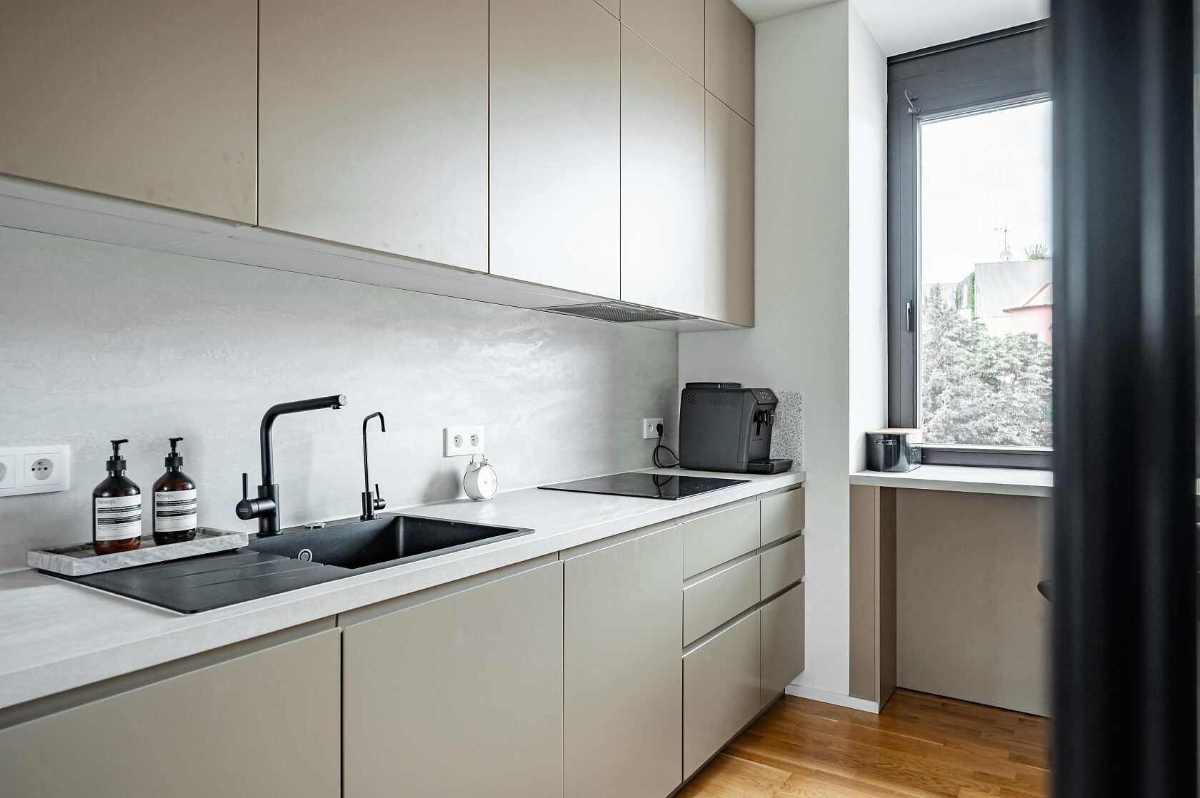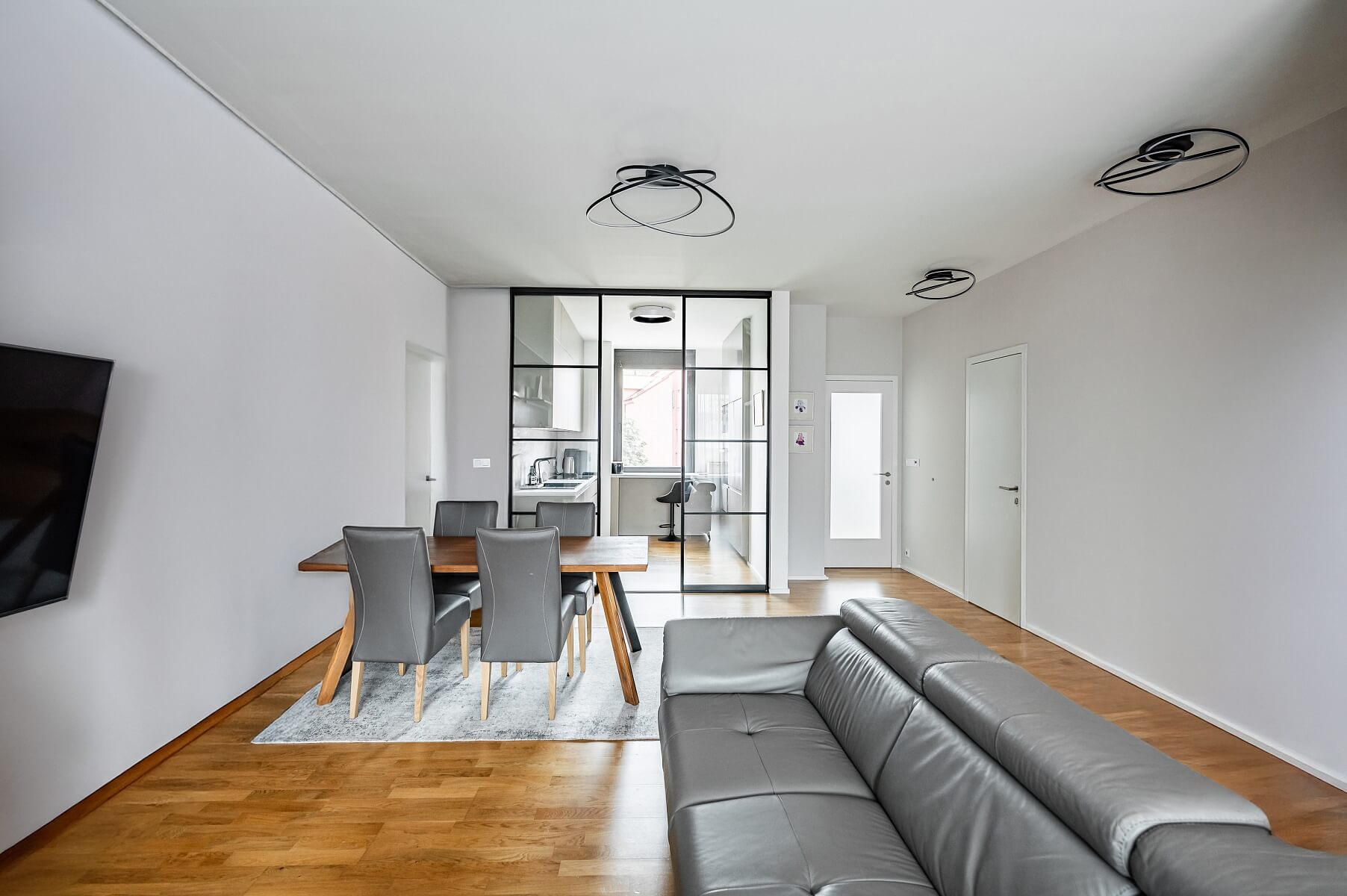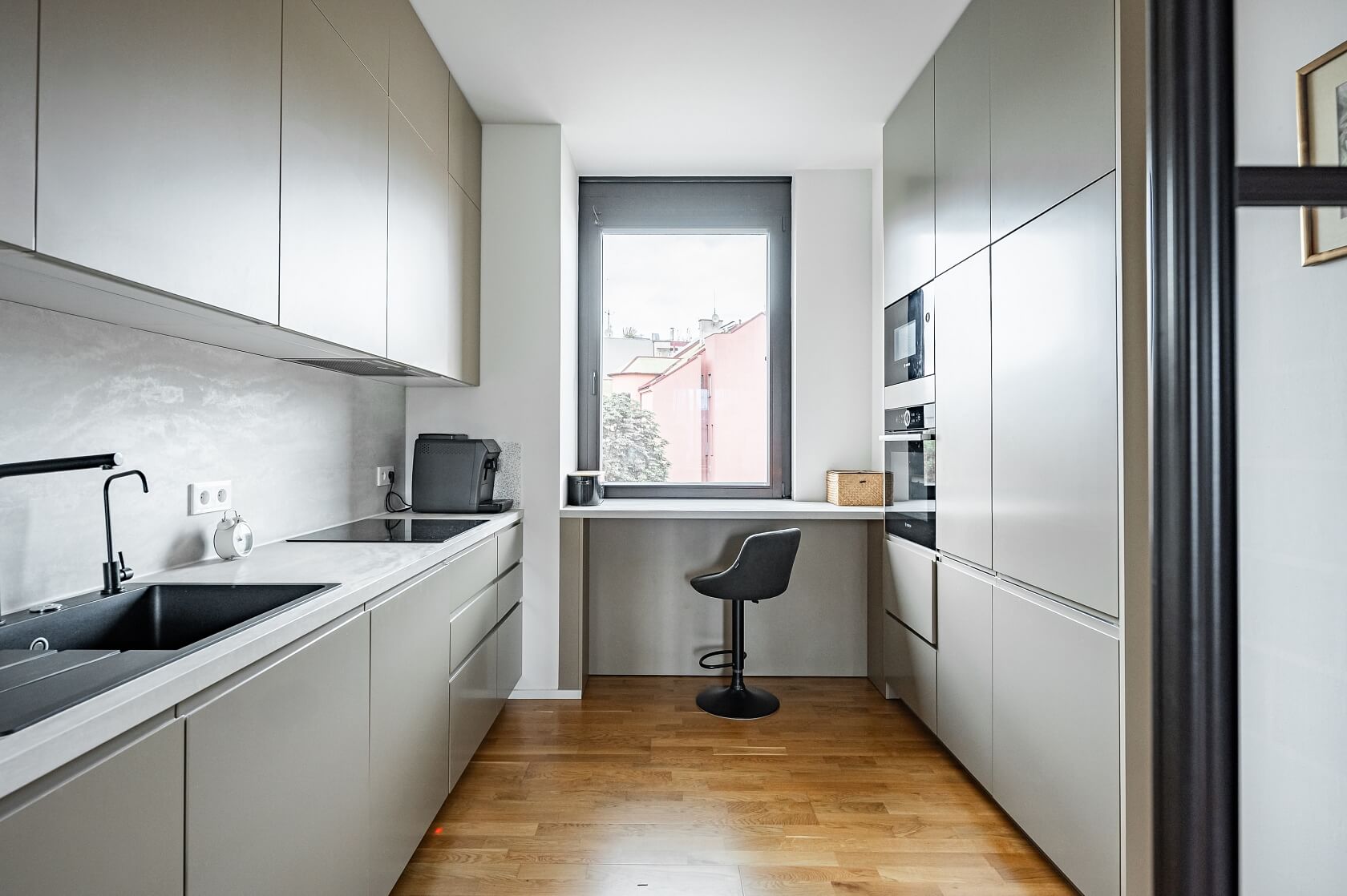 Moderně zařízený klimatizovaný byt s vysokými stropy, lodžií a 2 parkovacími místy je součástí polyfunkčního domu z r. 2024 stojícího blízko Libeňského přístavu a Palmovky, v místě s kompletní občanskou vybaveností.