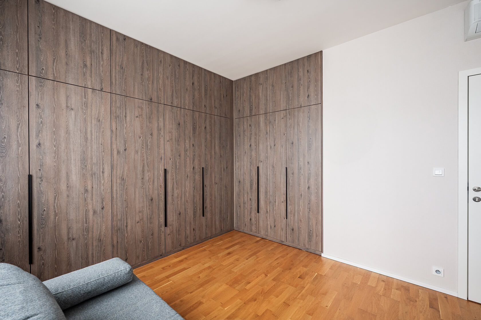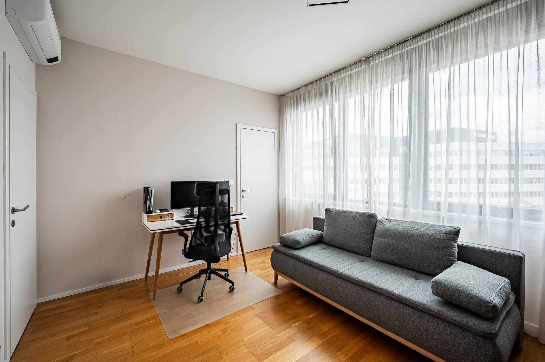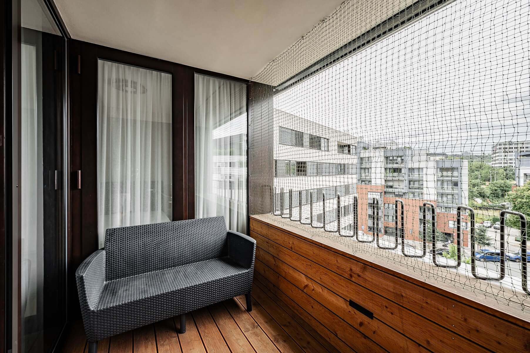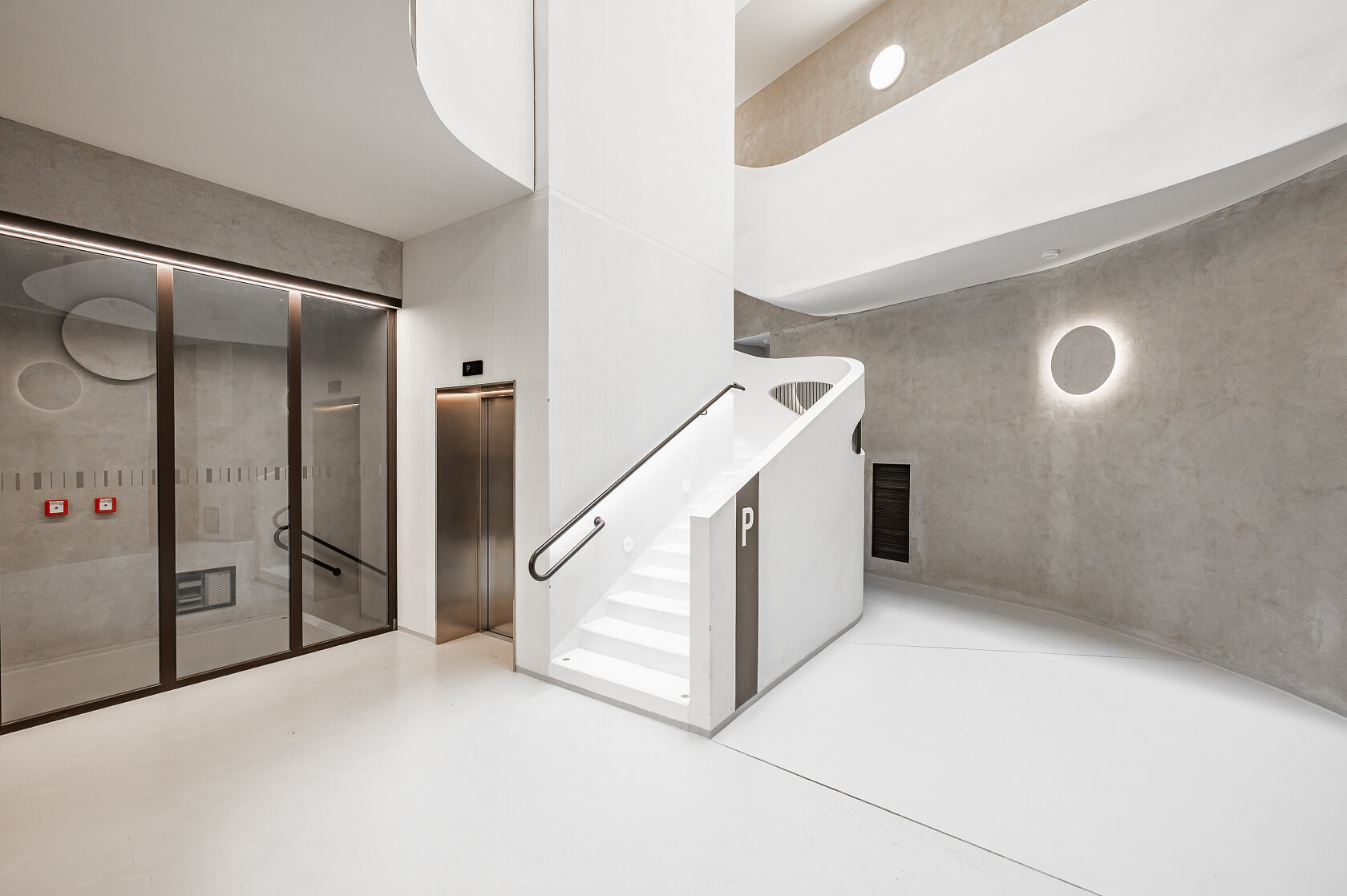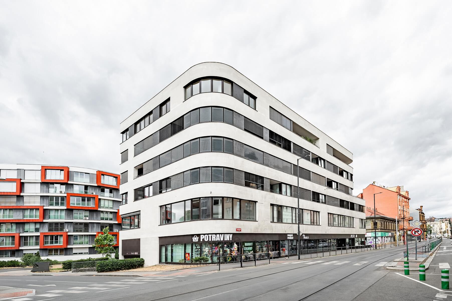 Tvarově zajímavá stavba byla zkolaudována v r. 2024. Ke standardu patří dřevěné podlahy, velkoformátová okna s dvojskly a venkovními roletami, bezfalcové dveře, optický kabel, klimatizace a dálkově ovládané centrální vytápění. Kuchyně na míru je vybavena spotřebiči Bosch, kupní cena zahrnuje veškerý vyobrazený nábytek. K bytu přísluší sklep a 2 parkovací stání (jedno v zakladači, druhé standardní v garáži), obyvatelům je k dispozici výtah a kočárkárna.