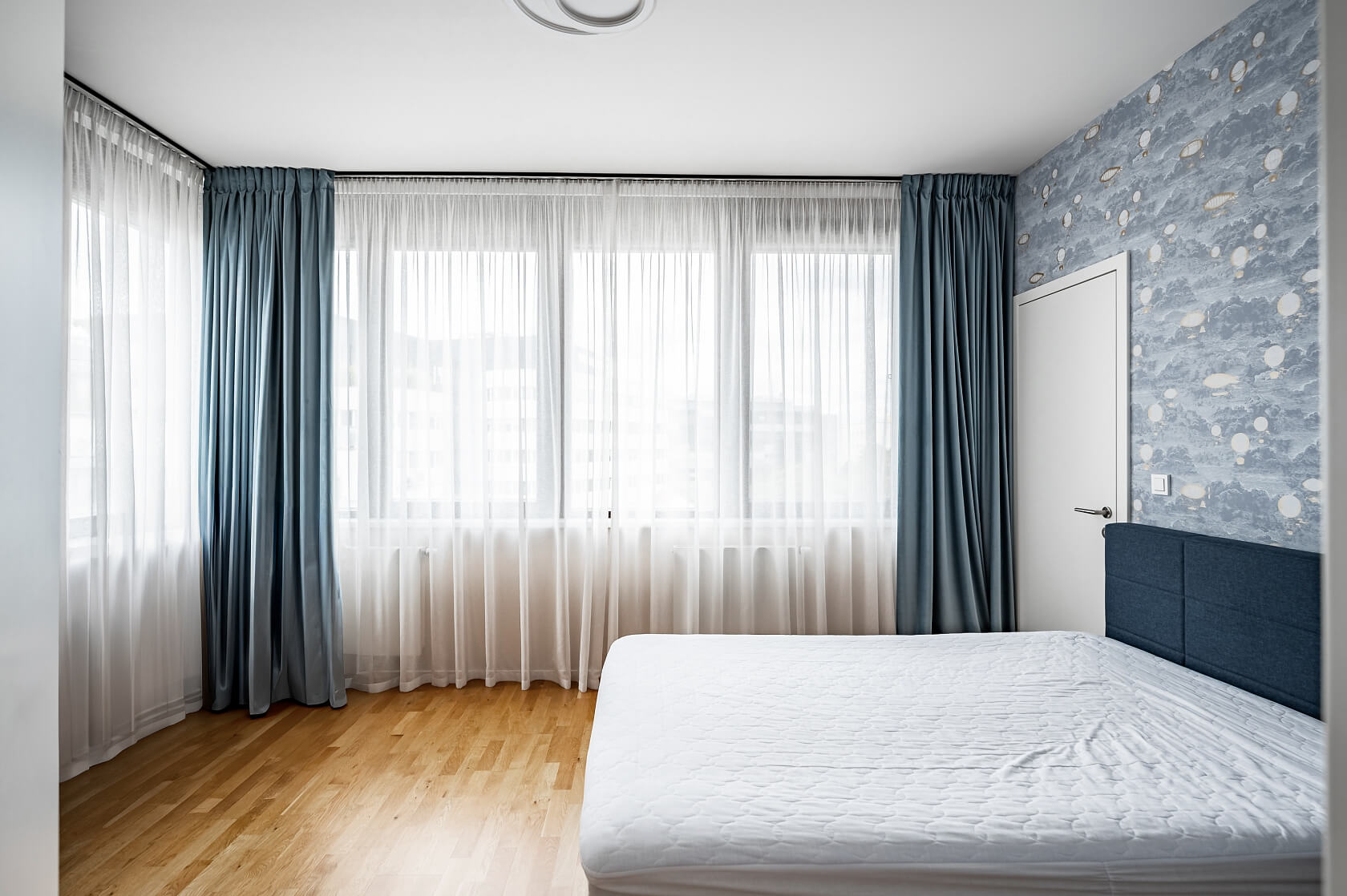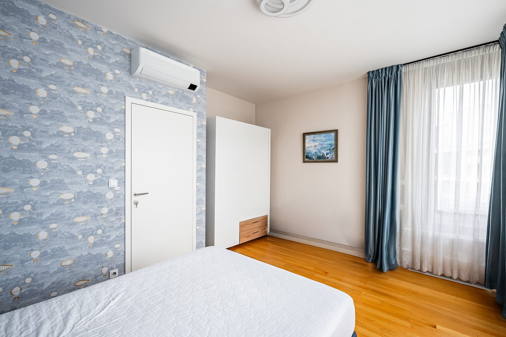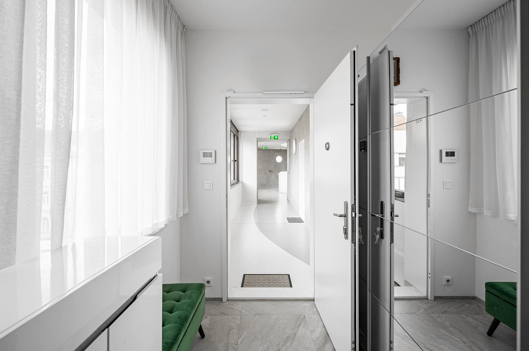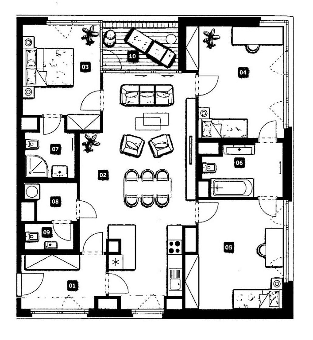 Více než stometrová plocha bytu umístěného v 5. podlaží je prakticky rozdělena na velký obývací pokoj s jídelním prostorem a jižně orientovanou lodžií, kuchyni oddělenou od obývacího pokoje prosklenou stěnou, dále hlavní ložnici s en-suite koupelnou (se sprchovým koutem a WC), druhou koupelnu (s vanou) přístupnou z dalších dvou ložnic, technickou místnost s přípojkou na pračku a sušičku, samostatnou toaletu a předsíň s přístupem denního světla. Všechny pobytové místnosti jsou orientované do vnitrobloku, na patře bloku budovy jsou pouze 2 jednotky.