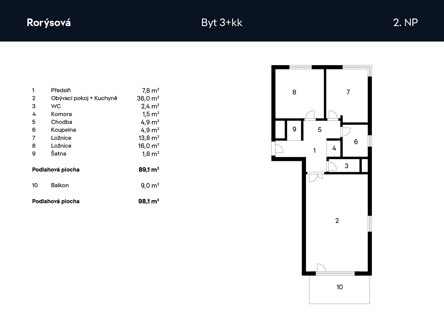 Podlahová plocha 88,7 m2, balkón 9 m2, sklep 4,3 m2.