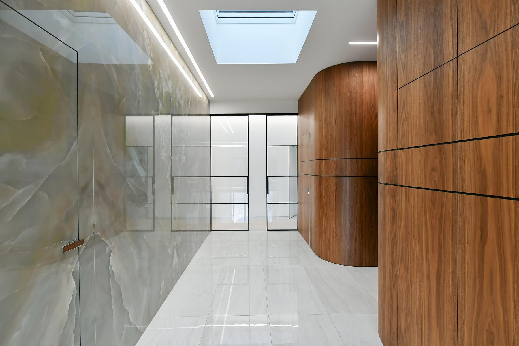 Interiér je zalitý přirozeným světlem díky světlíku, ateliérovým i velkoformátovým oknům, která plynule propojují obytný prostor s terasou. Čisté linie se zde prolínají s prémiovými povrchy a pečlivě navrženým nábytkem na míru. Podlahy z přírodního kamene v kombinaci s podlahovým topením zajišťují příjemné klima po celý rok, atmosféru v obývacímu pokoji navozuje krb na dřevo. Vytápění je řešeno vlastním kotlem.