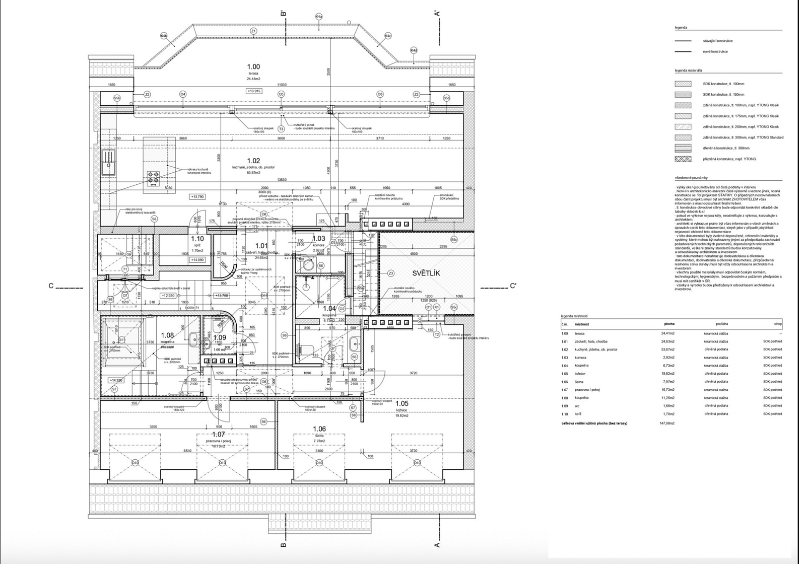 Podlahová plocha 157,4 m2, terasa 24,4 m2, sklep 17,5 m2.