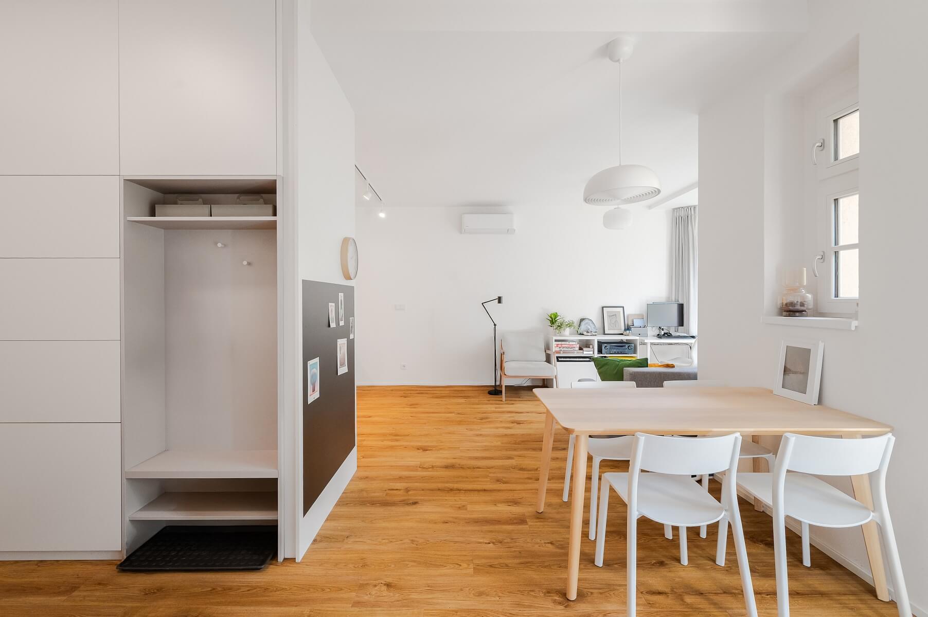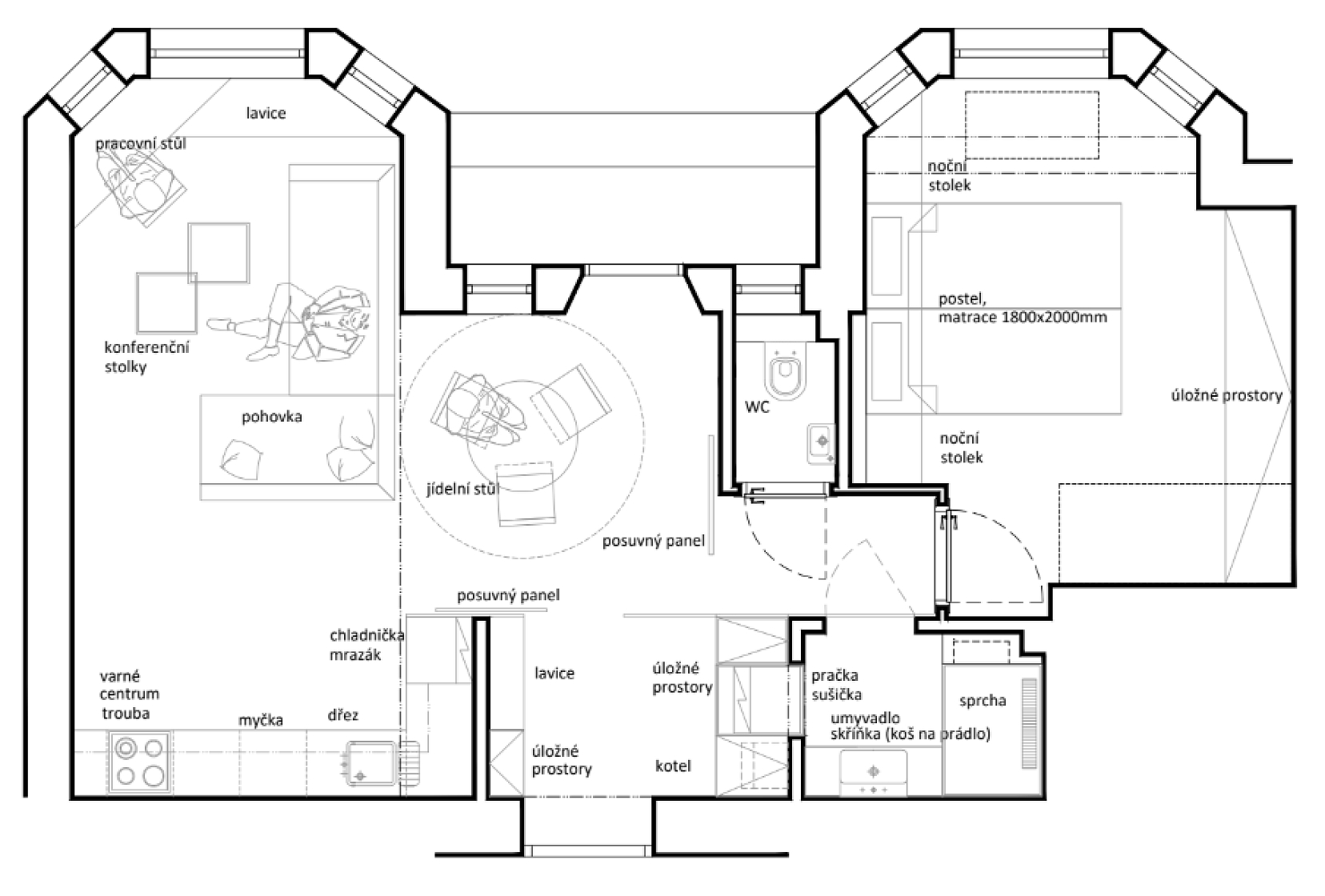 Praktickou dispozici tvoří obývací pokoj s otevřenou kuchyní, jídelnou a pracovním koutem, ložnice, koupelna (se sprchou), samostatná toaleta a předsíň. Z obývací části vede vstup na lodžii.
