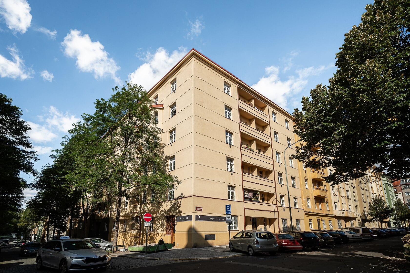 Klimatizovaný byt se dvěma arkýři a lodžií se nachází ve 4. podlaží cihlového bytového domu, který stojí v boční jednosměrné ulici lemované vzrostlým stromořadím, asi 10 minut jízdy MHD od centra metropole.