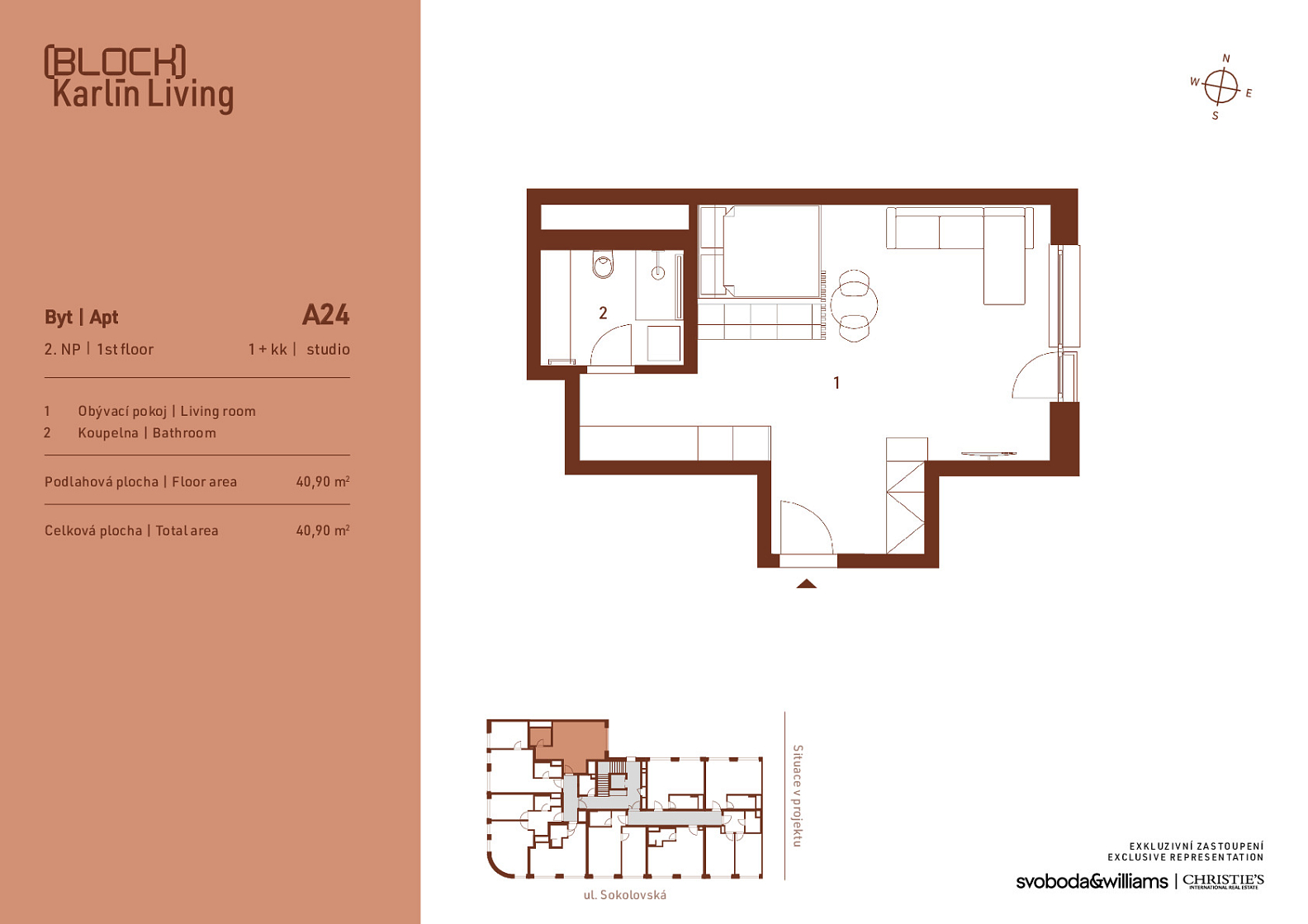 Nabízíme k pronájmu novou, kompletně zařízenou garsoniéru v 1. patře nově postaveného rezidenčního projektu Block Karlín Living se společnou terasou na střeše, podzemním parkováním a klidným upraveným vnitroblokem. Sedmipodlažní dům pochází z dílny zavedené architektonické kanceláře Architekti Headhand. Budova se nachází ve vyhledávané pražské čtvrti Karlín v pěším dosahu stanic metra Invalidovna a Křižíkova, i v blízkosti zastávky tramvají. Trendy lokalita s rychlým spojením do centra nabízí kompletní občanskou vybavenost a služby. Bezprostřední okolí tvoří řada moderních business a administrativních center i tradiční městská zástavba s kosmopolitním mixem restaurací, kaváren, bister a obchodů. Čtvrť nabízí pestrou paletu příležitostí k aktivnímu vyžití např. v podobě tenisových kurtů, golfových odpališť, cyklostezky a řady fitness center.