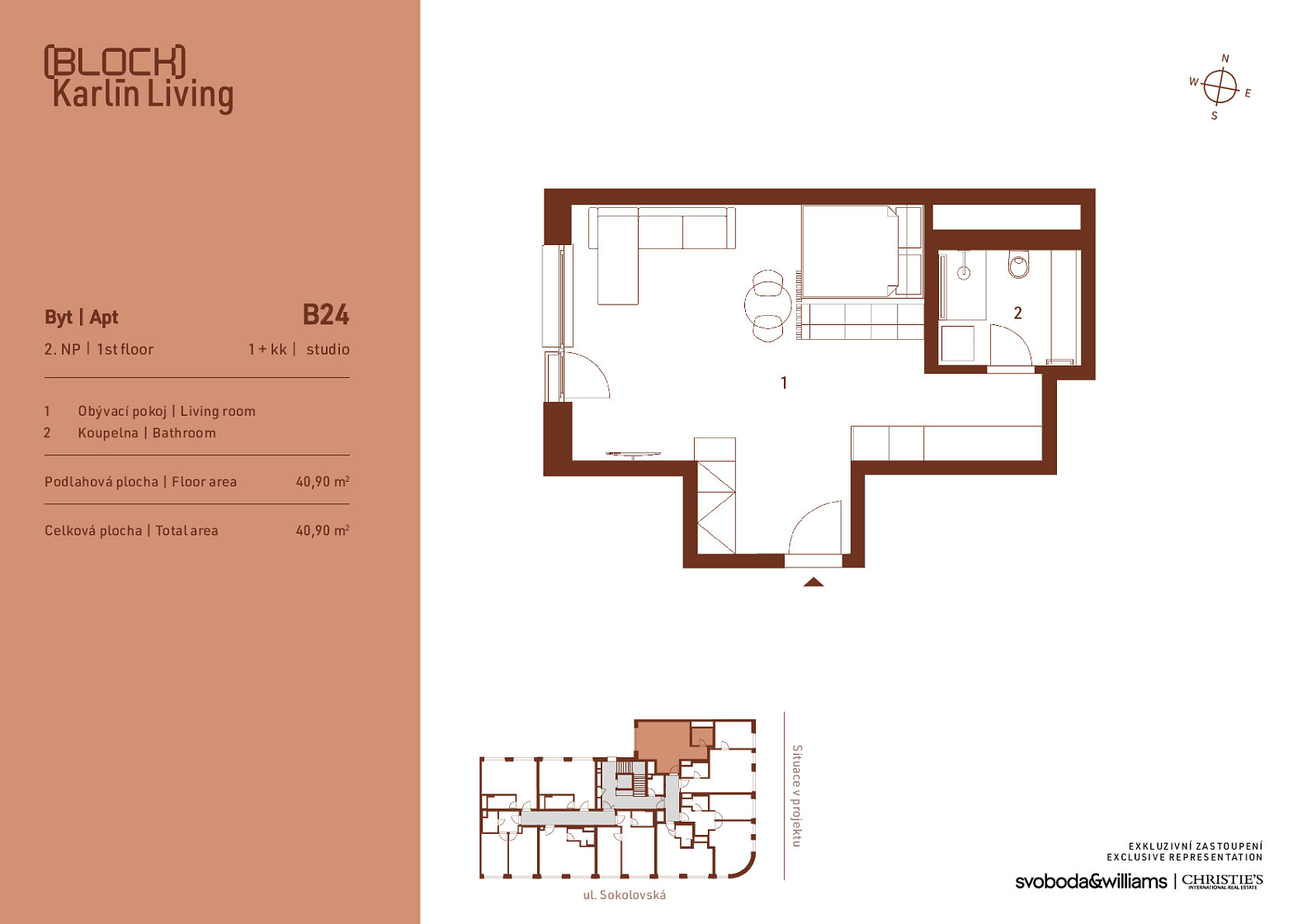 Nabízíme k pronájmu novou, kompletně zařízenou garsoniéru v 1. patře nově postaveného rezidenčního projektu Block Karlín Living se společnou terasou na střeše, podzemním parkováním a klidným upraveným vnitroblokem. Sedmipodlažní dům pochází z dílny zavedené architektonické kanceláře Architekti Headhand. Budova se nachází ve vyhledávané pražské čtvrti Karlín v pěším dosahu stanic metra Invalidovna a Křižíkova, i v blízkosti zastávky tramvají. Trendy lokalita s rychlým spojením do centra nabízí kompletní občanskou vybavenost a služby. Bezprostřední okolí tvoří řada moderních business a administrativních center i tradiční městská zástavba s kosmopolitním mixem restaurací, kaváren, bister a obchodů. Čtvrť nabízí pestrou paletu příležitostí k aktivnímu vyžití např. v podobě tenisových kurtů, golfových odpališť, cyklostezky a řady fitness center.