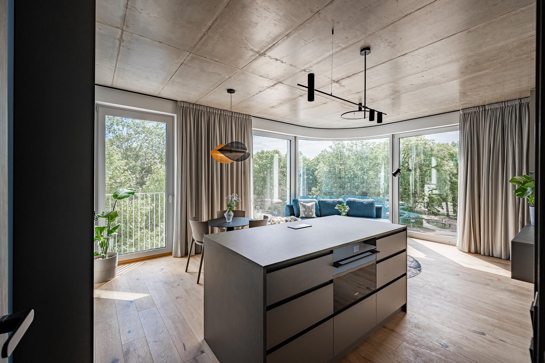 Klimatizace, řízené větrání, masivní dřevěné podlahy, velkoformátová dlažba, vestavěné úložné prostory, předokenní rolety, centrální podlahové vytápění, pračka se sušičkou, myčka, indukční varná deska, videotelefon, kolárna v budově, nabíječka na elektromobily v garáži. Možnost pronájmu garážového stání a sklepa za dodatečný poplatek.