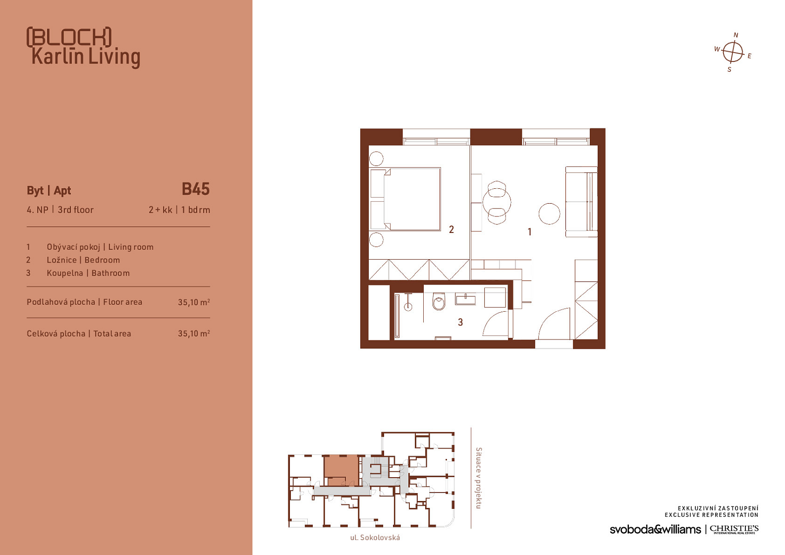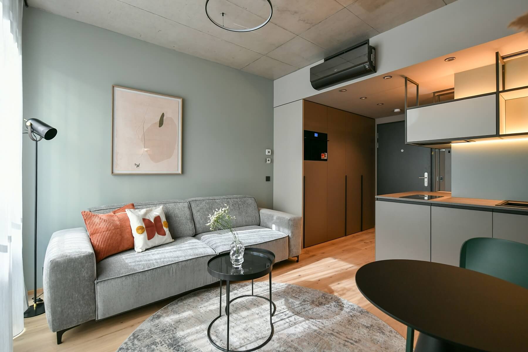 Nabízíme k pronájmu nový, kompletně zařízený byt ve 3. patře nově postaveného rezidenčního projektu Block Karlín Living se společnou terasou na střeše, podzemním parkováním a klidným upraveným vnitroblokem. Sedmipodlažní dům pochází z dílny zavedené architektonické kanceláře Architekti Headhand. Budova se nachází ve vyhledávané pražské čtvrti Karlín v pěším dosahu stanic metra Invalidovna a Křižíkova, i v blízkosti zastávky tramvají. Trendy lokalita s rychlým spojením do centra nabízí kompletní občanskou vybavenost a služby. Bezprostřední okolí tvoří řada moderních business a administrativních center i tradiční městská zástavba s kosmopolitním mixem restaurací, kaváren, bister a obchodů. Čtvrť nabízí pestrou paletu příležitostí k aktivnímu vyžití např. v podobě tenisových kurtů, golfových odpališť, cyklostezky a řady fitness center.