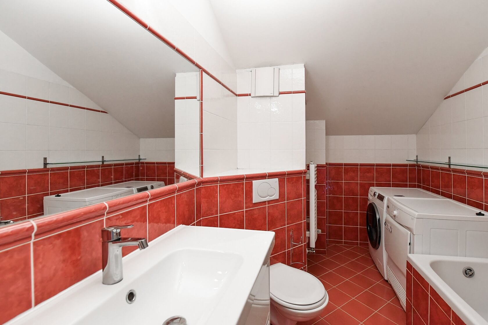 Dřevěné parkety, dlažba, centrální plynové topení, pračka, sušička, myčka.